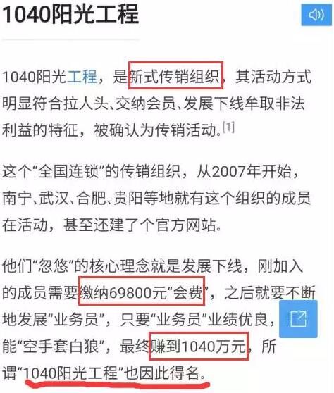 “1040阳光工程”为新型传销组织,新型传销特点如下: