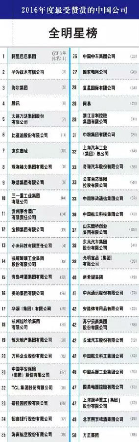 这份榜单一向被认为是中国公司软实力的晴雨表,今年的排行榜由《财富》(中文版)通过网络向35000名中国企业管理人发放问卷调查得出。调查评分标准主要包括产品和服务地位、长期投资价值、公司资产合理利用、创新能力、管理质量、财务稳健程度、吸引和保留人才的能力、社会责任、全球化经营的有效性9个方面,综合得分最高的50家公司荣登“最受赞赏的中国公司”全明星榜。