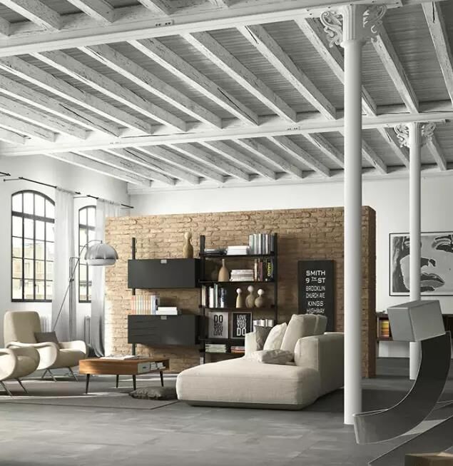 水泥灰的瓷砖,白色吊顶及墙面,营造出一种略微冰凉不近人情的工业氛围,空阔粗糙的设计感,组成一个有着极大吸引力的家居风格。