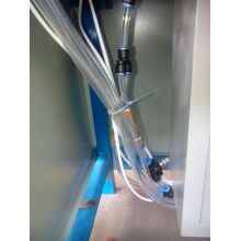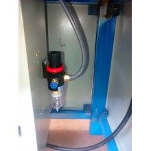 将腻子粉包装袋套在出料嘴上,拨动弹簧开关,压袋气缸开始工作并压住袋口,控制器将包装袋重量自动去除,通过空压机的气流经三分管分成三路,其中一路去往进料口进行破拱,保证下料畅通。叶轮高速转动迅速将物料拨出灌入袋中,随袋中空气一起溢出的粉尘经排气孔排出(对环保要求高的用户也可连接吸尘器,由除尘器吸走)。待加料达到粗流设定值(L1)时,气缸自动将橡胶软管夹至1/2开口,出料速度减慢,到总设定(L2)时,气缸将橡胶软管完全夹死,出料停止,压袋气缸松开袋口,灌装结束。
