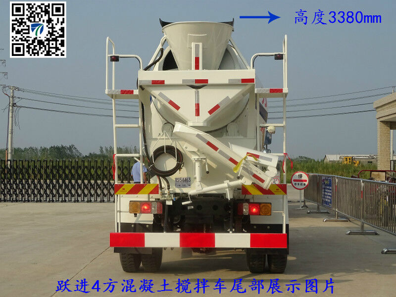 依维柯跃进开拓4方-5方ued网站搅拌车介绍:单排白色驾驶室,发动机玉柴130马力发动机,145前后桥,8.25-20尼龙胎, 小八档带高低档、轴距3300mm。