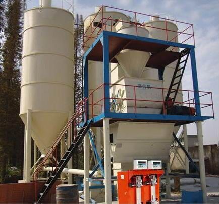 腾飞集团腻子粉生产设备年产两到三万吨左右的腻子粉生产设备,一般情况下会用到4-6个原料罐,其中两个大罐用于装放散装水泥和粉煤灰,其余小罐用于装放轻钙、 重钙、砂、小料等。散装水泥和粉煤灰进罐不需要提升设备,依靠泵车打入。轻钙、重钙、砂、小料等需要使用斗式提升机提入小罐,巧妙的物料分配系统支持一个斗式提升机分配式作业,从而避免了资源浪费。
