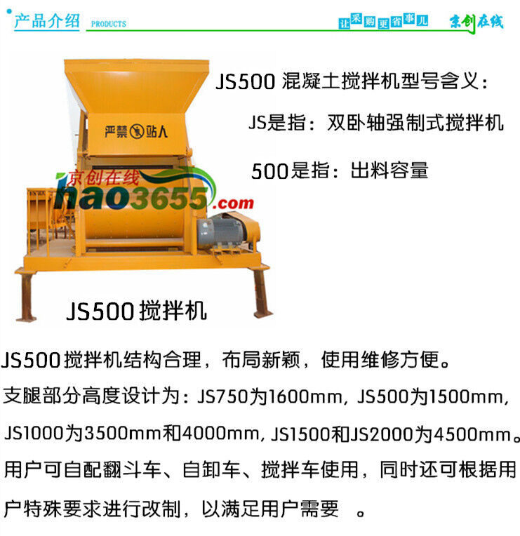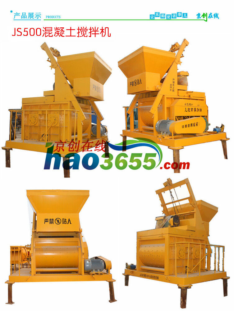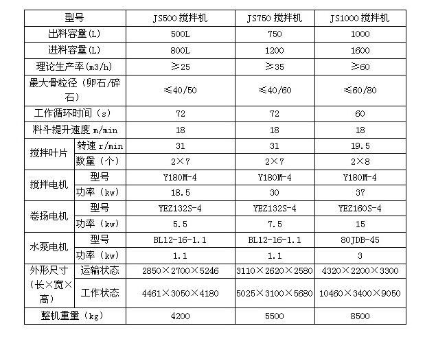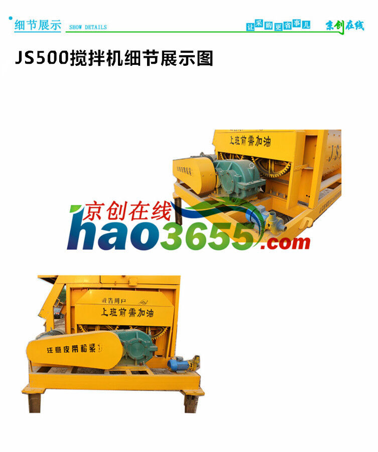 JS500双卧轴强制式搅拌机 搅拌系统分别由电机、皮带轮、减速箱、齿轮、搅拌装置、搅拌筒等组成。