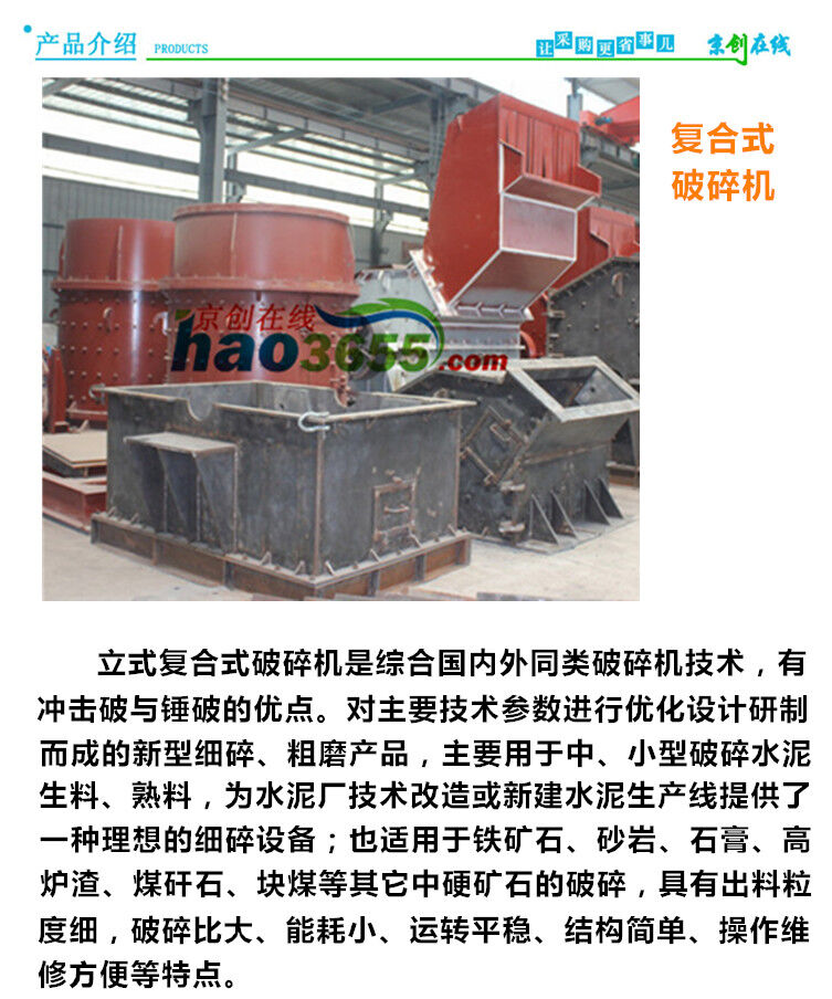 复合式破碎机800简称为复合破,是破碎生产线和制砂生产线中常用设备之一。复合破碎机是一种无筛条、可调式细碎设备,可广泛适用于水泥厂的生料、熟料细碎作业,同时也可用于白云石、焦宝石、铅锌矿、蛇纹石、高炉渣、煤矸石、磷矿石等中等硬度物料的细碎作业,特别适用于硬质石灰岩、白云岩、花岗岩、玄武岩等人工造砂或高速公路路面石料的加工破碎。