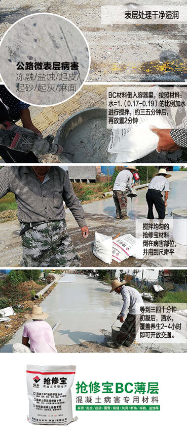 抢修宝BC薄层修补材料,可实现3毫米以上的超薄层快速修补,美观度高,而且具有防冻和抗腐蚀性能。农村公路的起砂病害用抢修宝BC薄层修补材料进行修补,受到了甲方及施工单位的认可,并且建立长期合作。