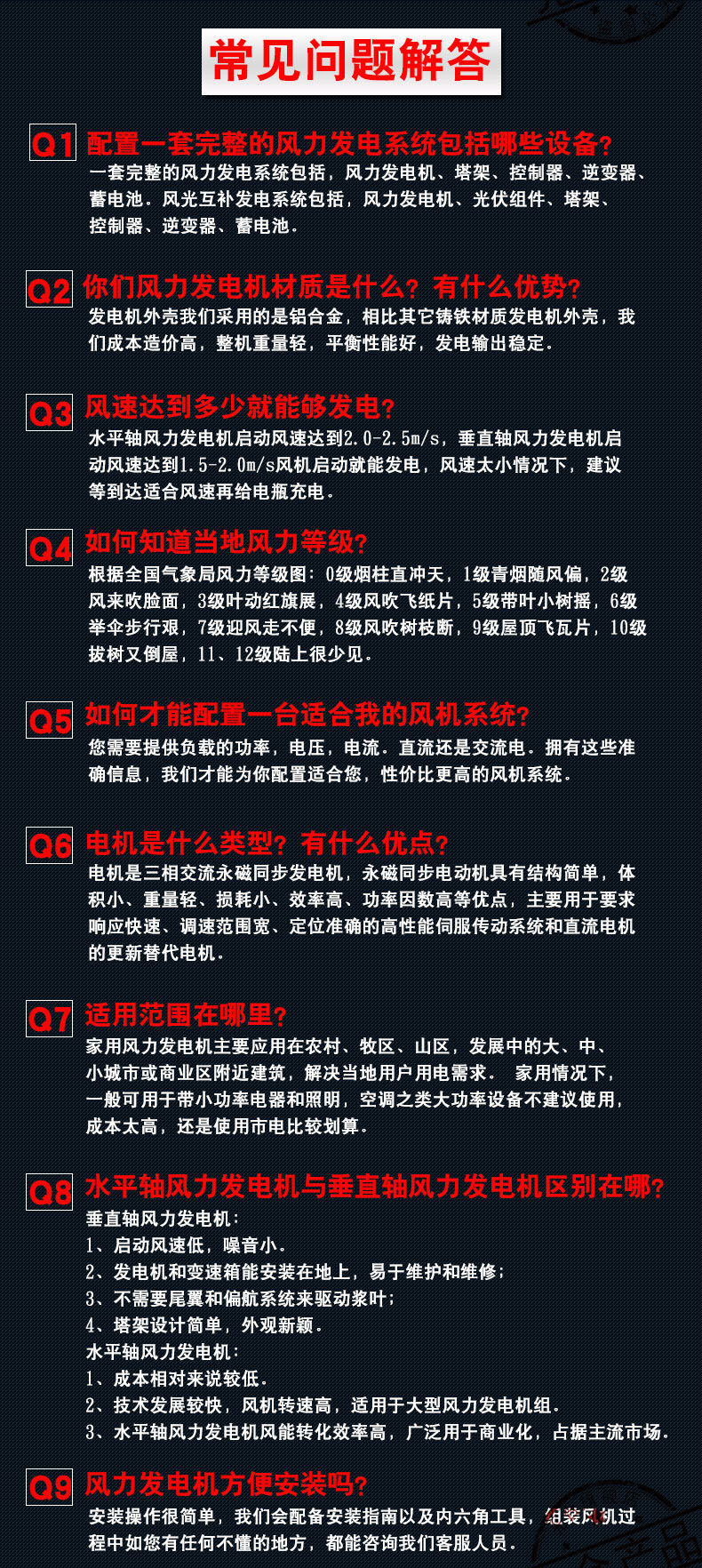 注意:以上宝贝报价为风力发电机主体的价格(含:5KW发电机、回转体、尾舵、风轮、风叶等组件),如需逆变器、蓄电池、控制器、太阳能板或塔架,请咨询客服。