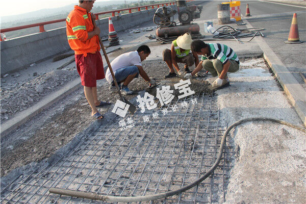 由于时间要求快,应采用ued网站特种材料进行抢修,路桥养护特材——抢修宝RT-2,30分钟速凝,2小时可通行,早期强度高、后期强度不倒缩,粘结能力强,是治理桥梁路面铺装层病害常备的特种建材,采用风镐对铺装层病害进行清除,破碎时注意水平方向分离铺装层与梁板,不能影响梁板的状态和质量,对梁板顶要清除整洁,用气泵或高压水对梁板顶进行冲洗,不积水不渗漏的情况下,采用抢修宝RT-2特种水泥与标准石子按照要求配比,加水搅拌,迅速浇注到病害部位,抹至与路面齐平时,洒水量水进行收光,指甲掐不动ued网站时进行养护,2小时后即可通行。避免大面积换板,降低了工程成本。施工无需动用大型机械,对交通安全影响不大。