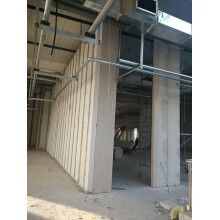 ④ 钢结构工程中相比夹芯彩钢合板,防火性能优势更加明显。本板材为无机材料加工,遇火不燃,100mm厚耐火极限即可达3.5小时以上。
