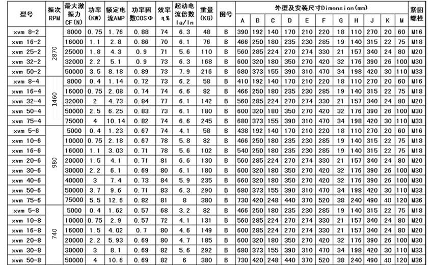 1)XVM振动电机 此型号振动电机系采用先进技术设计生产的振动电机。 XVM振动电机2)先进的设计技术:所有参数的计算及其优化设计均由计算机工作站全面完成。精密的加工工艺、严格的质量体系,保证了振动电机工作状态下各部件配合、承力在最佳范围内。 3)特殊的电磁设计:振动电机所需要配置的定、转子均采用具有优质导磁性能的硅钢片,减少铁芯的涡流损耗,保证强大的起动力矩,可快速达到额定运转速度。 4)重载型轴承设计:所采用轴承均为重载型特制轴承,足以承受和传递径向激振力和轴向负荷,并有良好的散热能力。双重密封设计,保证在严重粉尘环境下的轴承室清洁。选用进口耐高温轴承锂基脂润滑油,延长轴承使用寿命。 5)无极调节:振动电机两端的激振块上标有精确的刻度盘,可以非常容易的调节激振力及工作力矩从零到最大的无极调节,满足工作需要。 6)。XVM振动电机的设计可适用于各种标准电压及频率的三相交流电源,如适用于中国、欧洲的220/380V、50HZ电压等级;美国的230/460V、60HZ电压等级;日本的220V、50/60HZ电压等级等,能应用于世界各地。还可适用各种电气制动方式,如能耗制动、反接制动等。
