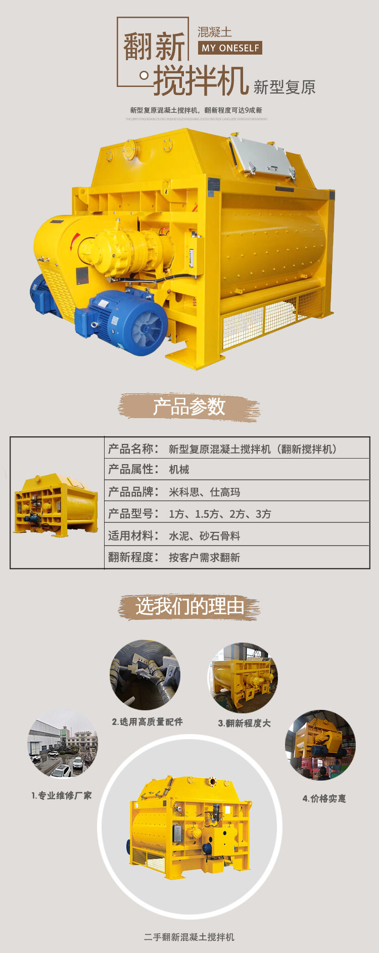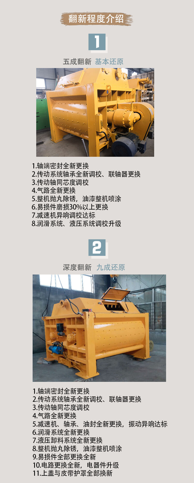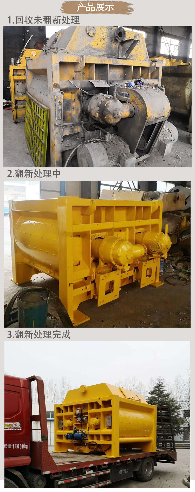 随着国家基础建设的大力推进,搅拌站转场的速度也在加快,有些搅拌机使用2-3年就被闲置,未能发挥出他的最优性能。一些搅拌机的主要部件性能任然很好。为了将这一部分设备重新利用,我公司拥有专业的人员、评估、回收、检修、然后再以崭新的面貌服务客户。