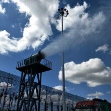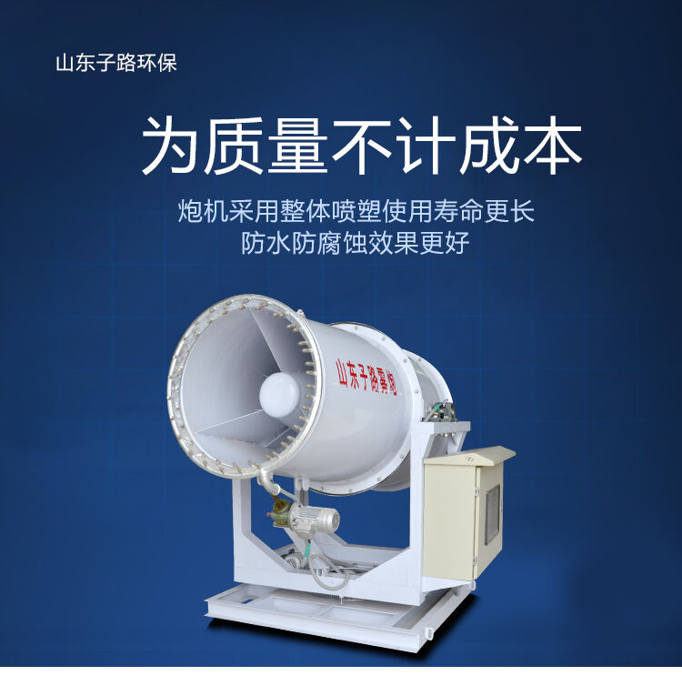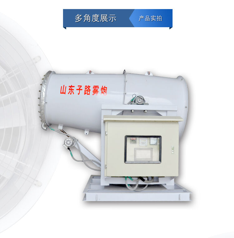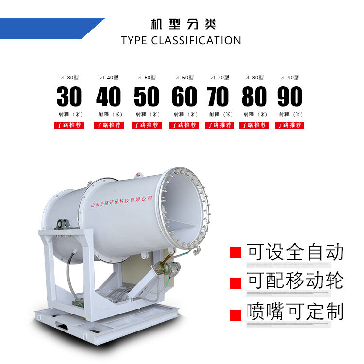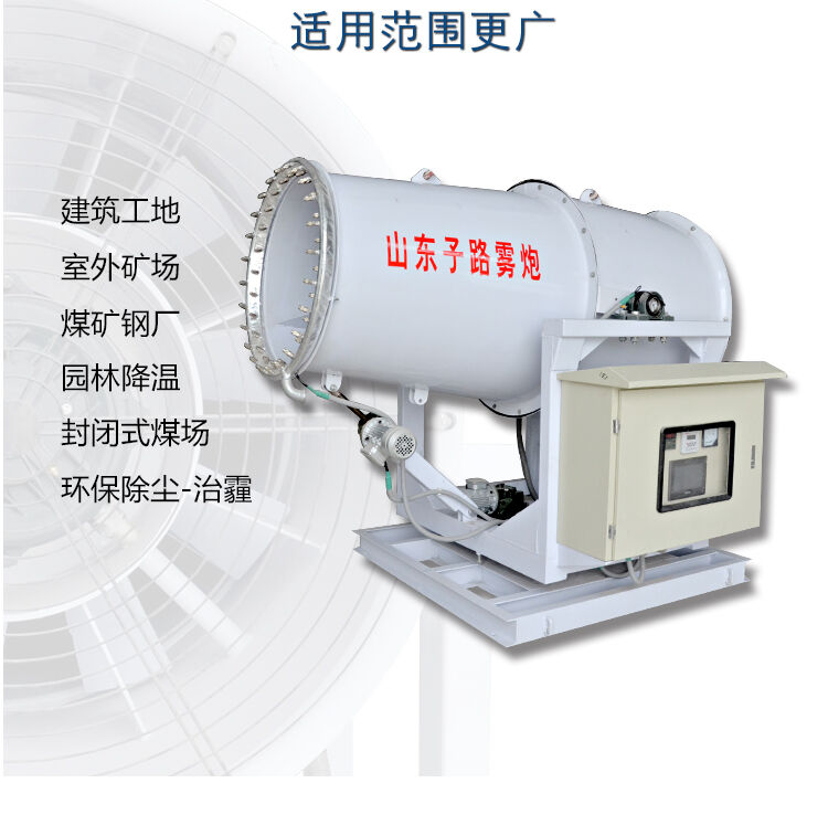 直径相近的水雾和的粉尘颗粒黏贴,减小水表面的张力,使粉尘颗粒与水雾聚结成团,在重力作用下,然后沉降到地面。达到有效降尘的目的。雾炮机的喷水距离为30到150米,具体规格可以定制,配套水箱可选3-10吨,主要作用是喷雾抑尘,