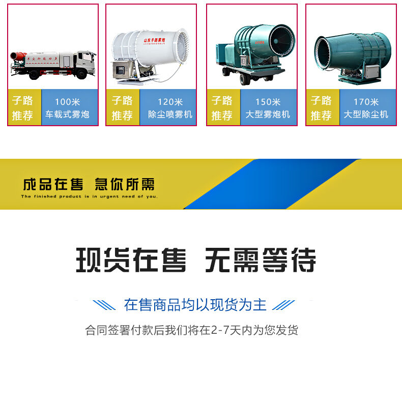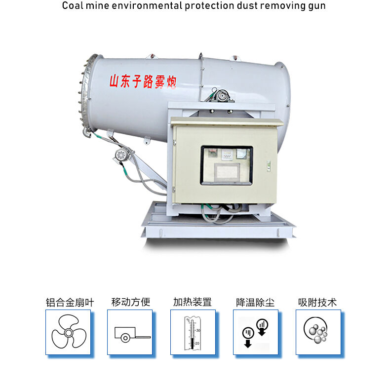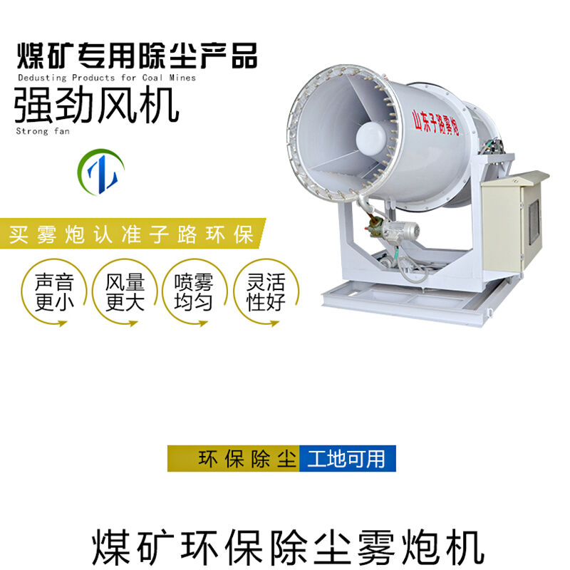 子路环保科技有限公司一款通过高压风机将储存的水压缩成灰尘大小,在利用不锈钢喷嘴部位将水雾化吹向高空净化空气的一种新型环保除尘产品。这款产品名字叫高射程雾炮机,