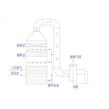 内设逆向填料吸收系统、喷淋系统、脱雾装置系统、下设供水箱、供水泵系统、进出风口、风机、风管、吸罩组成系统。