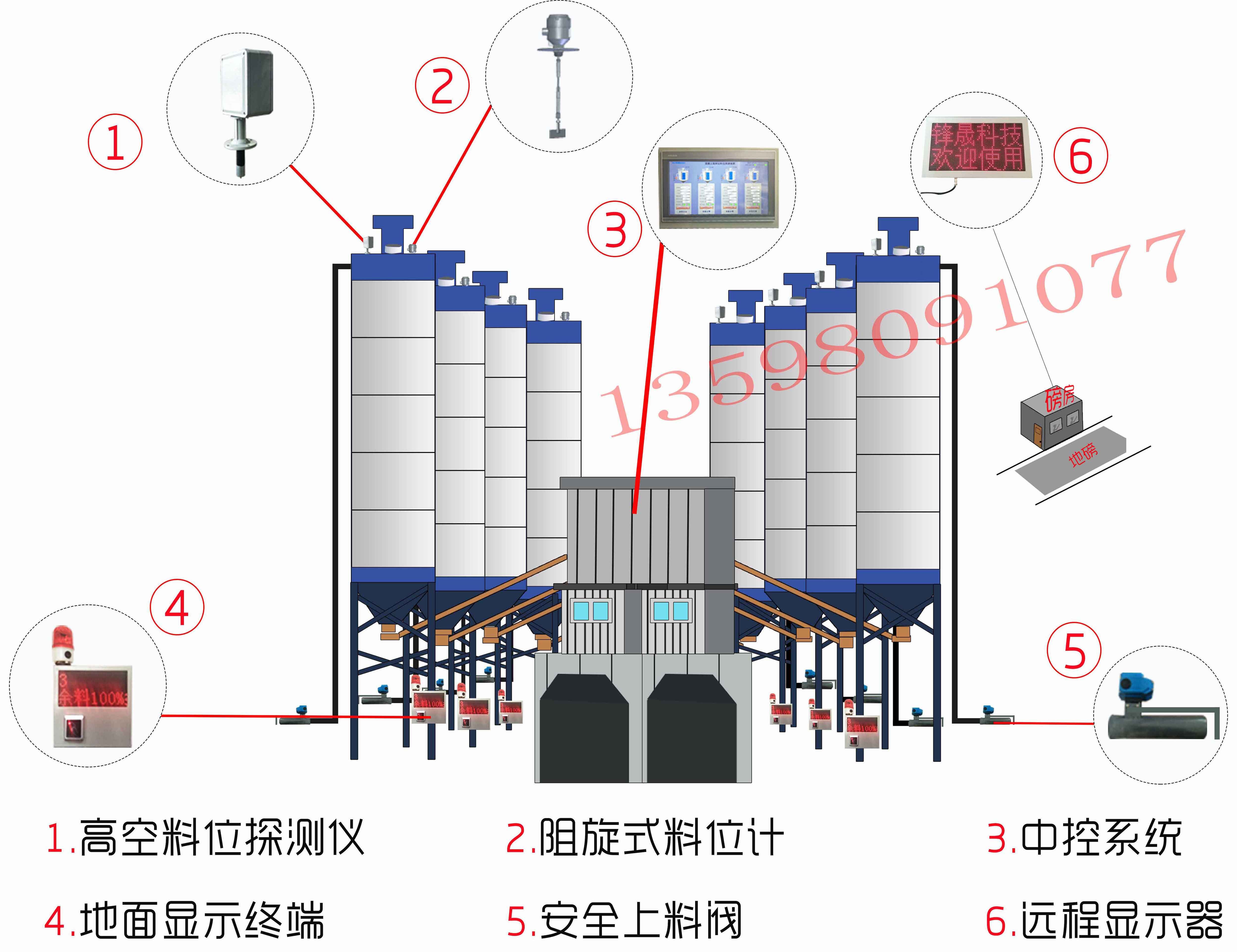 搅拌站抗粉尘料位计水泥仓智能料位计料位测量系统,可以对粉料仓中的物料高度变化进行感测,准确的记录水泥仓中物料的实时位置,方便管理;搅拌站抗粉尘料位计水泥仓智能料位计料位测量系统,解决了水泥罐冒仓、粉料上料时出错或打错仓、不能及时准确的判断水泥仓余量以及传统水泥仓不可靠不准确的问题。