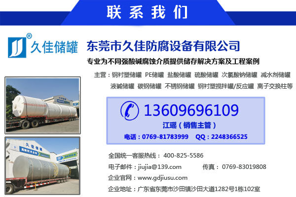 找质量上乘、服务一流的钢衬塑树脂罐搅拌罐供应商,选东莞市久佳防腐设备有限公司,公司是华南地区知名的防腐钢衬塑搅拌罐生产厂家,引进国外先进的技术设备以及滚塑工艺,品质保证。生产的防腐搅拌罐、钢衬塑储罐具有无焊接缝、不渗漏、耐腐蚀,抗老化,抗冲击,表面光滑结合力强。对一般酸碱盐的有机溶剂性能良好,适用于腐蚀性气体,液体及固体液,浆液介质的搅拌以及储存输送。