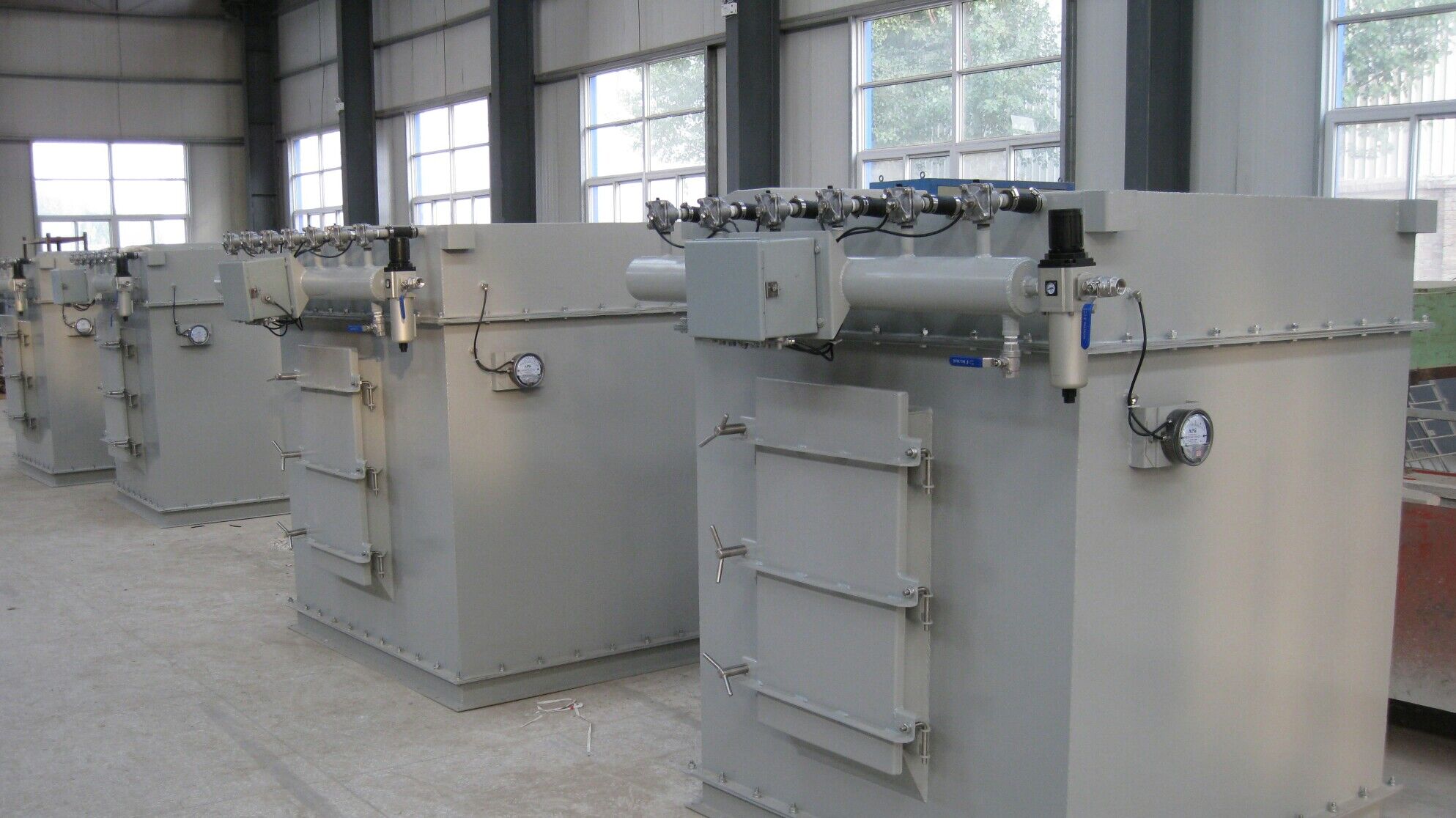 仓顶单机除尘器工作原理:仓顶单机除尘器的滤尘是通过滤芯进行的,滤滤芯材料玻纤,当含尘空气通过时,即可有效的使用固相与气相分离开来,玻纤的滤芯是一种多孔性的滤尘材料,当气流通过时,由于震动作用、使气流中的微粒吸附在滤芯上或沉降下来,净化后的空气即可排出,为了清除附着和沉入滤芯的灰尘,在每班通风机停止运行时(每隔约2-4小时)顺序振动除尘器,每次振动5下左右。