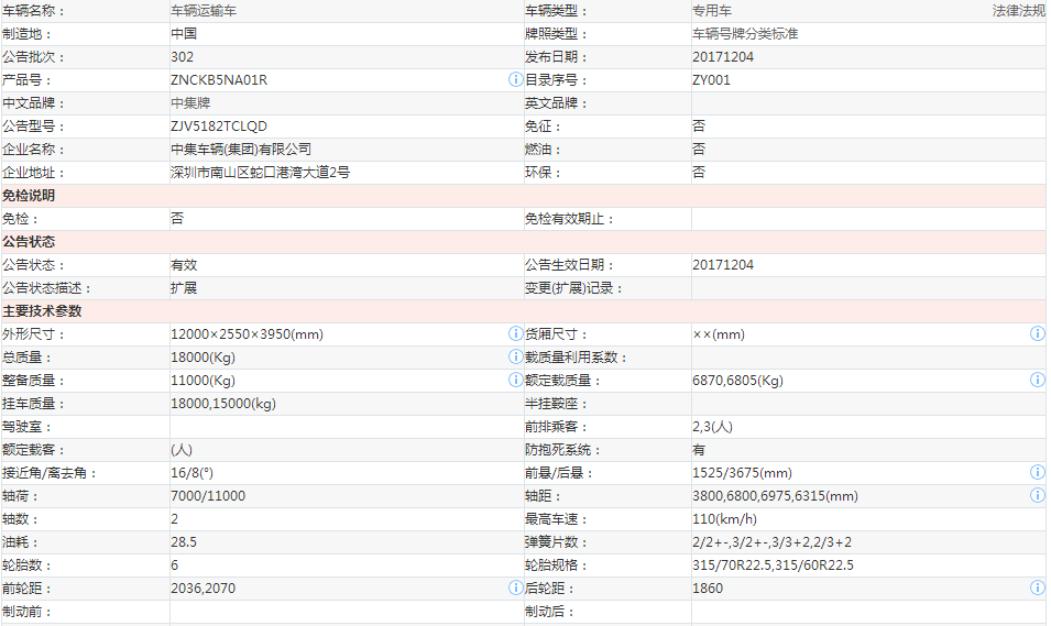 归属行业:ZJV5182TCLQD中集车辆运输车