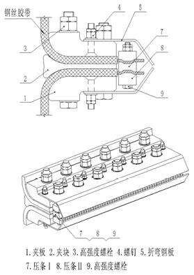 铝合金夹具,夹具采用综合性强的铝,此材料柔韧性,刚性,抗冲击性,拉断性是综合指数高的一种材料海顺德橡胶是国内最早研制钢丝绳芯提升带的专业生产厂家.