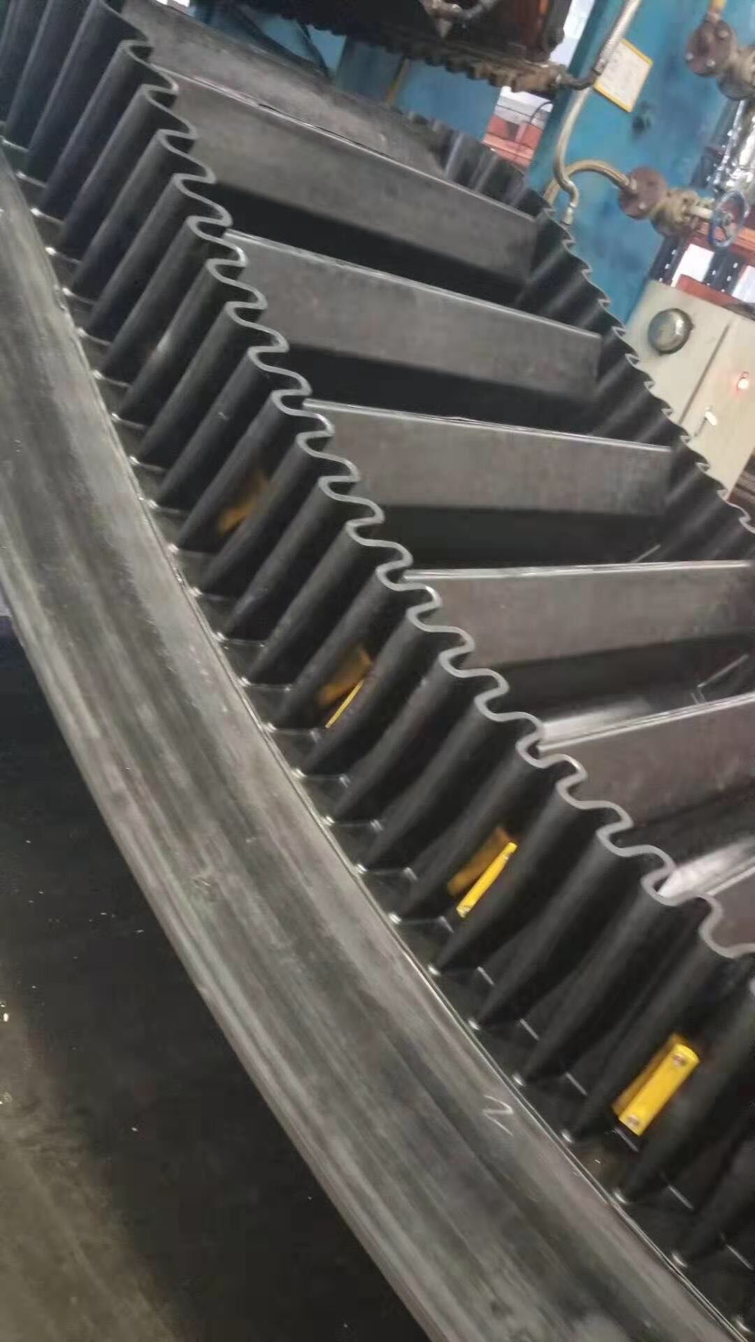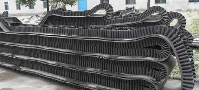 大倾角波状挡边带由基带、挡边、横隔板3部分组成。挡边起防止物料测滑撒落的作用。为便于绕过滚筒,档边设计成波纹状;横隔板的作用是承托物料,为了实现大倾角输送,采用T型TC型。档边和横隔板是用二次硫化的方法与基带连接的,具有很高的连接强度。