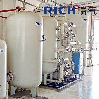 瑞气所生产的制氮机采用变压吸附技术,以空气为原料制取氮气。变压吸附制氮技术,一般采用PSA碳分子筛为吸附剂,碳分子筛对氧氮的吸附速度相差很大,在短时间内加压情况下,氧的吸附速度大大超过氮的吸附速度,氧分子被碳分子筛大量吸附,而氮分子吸附很少,利用该特性来完成氧氮分离。碳分子筛对氧的吸附容量随压力的降低而减少,减低压力,被吸附的氧分子则从碳分子筛中逸出,通过塔的下部进入消音器后排出大气,即可解吸,完成碳分子筛的再生。另外,碳分子筛对二氧化碳和水分也有吸附能力,且较易减压解吸。通常PSA制氮机采用双吸附并联交替进行吸附产氮,解吸再生,实现氧、氮分离,连续供气。