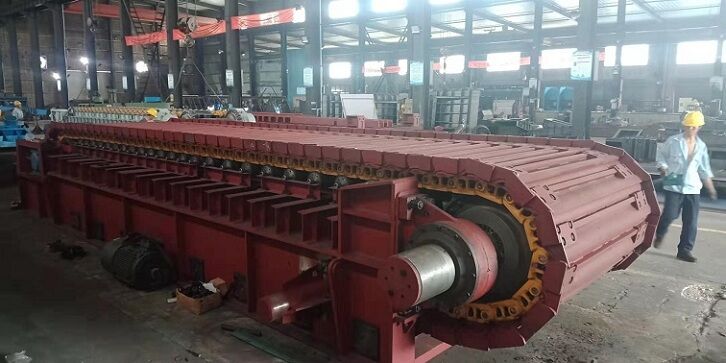 5、头尾轮应采用优质铸钢件并经良好的热处理,应带有张紧装置。喂料仓与板喂机之间应设有溜槽,板喂机带支架和支腿。