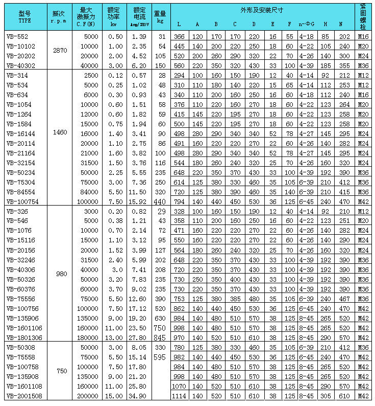 VB-1264-W振动电机外形安装尺寸技术参数表