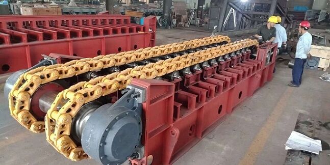 由于板喂机是通过链轮、链条、链板、传动等一系列全钢结构的刚性机架将物料拖出库底的。所有的料仓压力由板式给料机承担,避免的由于料仓压力过大把皮带秤压坏现象。