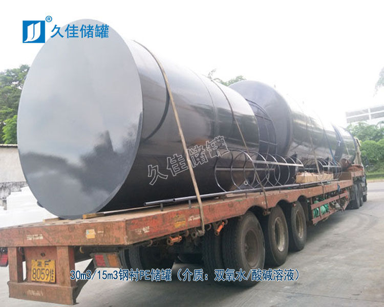 立式双氧水储罐 48立方 钢衬塑储罐材质 防腐化工过氧化氢储罐:龟甲衬里技术,外钢板,中间设计龟甲网、内衬塑料PE层;PE塑料本身与双氧水不发生化学反应,可耐双氧水腐蚀,双氧水钢衬pe储罐是连接层用冲压成型的钢质菱形网设计与制作,钢、网、塑三合一滚塑复合工艺,三合一的三重保护,强度高、耐腐蚀、经久耐用,一般设计使用寿命在10年以上,适用于各种浓度双氧水的储存。
