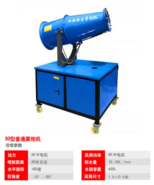 5、 喷雾时可按照需求进行水平喷射角度和俯仰角度调整,水平扭转可在电控箱上或遥控器上点动“向左”或“向右”按钮进行调整,俯仰角可按照必要在电控箱上或遥控器上点动“向上”或“向下”按钮进行调整;液体通过液泵产生雾状由喷嘴喷至喷筒口,再经风机风力切割破裂后喷向物体。