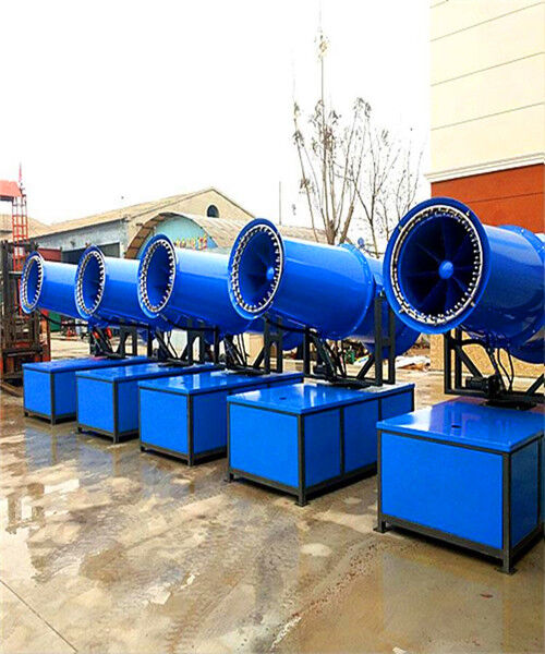 除尘喷雾炮是根据送风原理,先使用进口高压泵、微细雾化喷嘴将水雾化,利用风机风量和风压将雾化后的水雾送到较远距离,使得水雾到达较远距离能够覆盖大面积,水雾与粉尘凝结后降落,从而达到降尘目的。