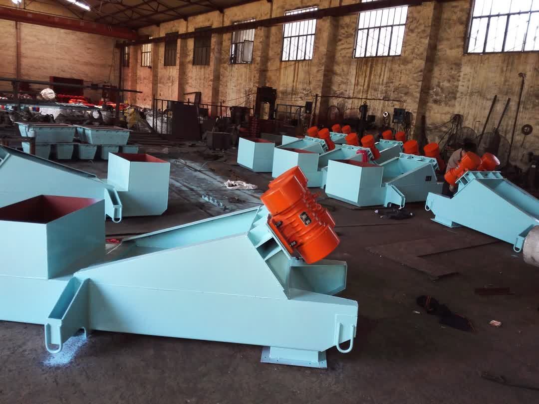 电机振动给料机的给料过程是利用特制的振动电机驱动给料槽沿倾斜方向作周期直线往复振动来实现的,当给料槽振动的加速度垂直分量大于重力加速度时,槽中的物料将被抛起,并按照抛物线的轨迹向前跳跃运动,抛起和下落1/50秒内完成,由于振动电机的连续激振,给料槽连续振动,槽中的物料则连续向前跳跃,以达到给料目的。