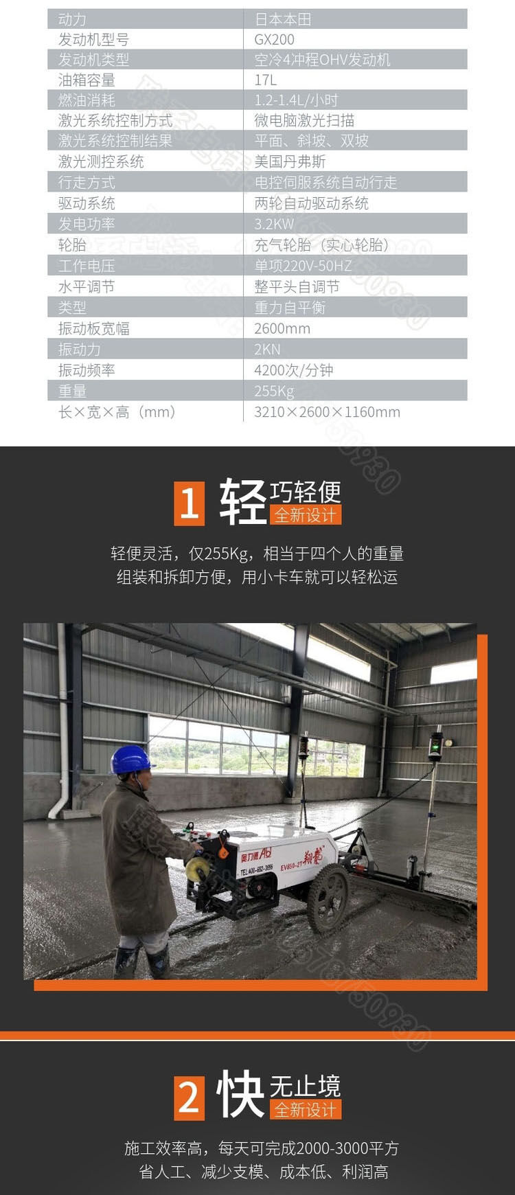 二、激光对点,高精准、低误差:传统工艺找平需要支模板来控制地面的标高,拉控线。标高误差较大。整个地坪的水平度和平整度不能保证。采用激光对点发射器,适用于大面积一次铺筑。有激光测控系统实时控制标高,找平不需要拉线,中间也不需要支侧板来控制地面标高。从而避免了施工过程中因模板(槽钢)的震动而带来的标高误差,也减少了传统人工传统人工分块支模引起的标高误差。
