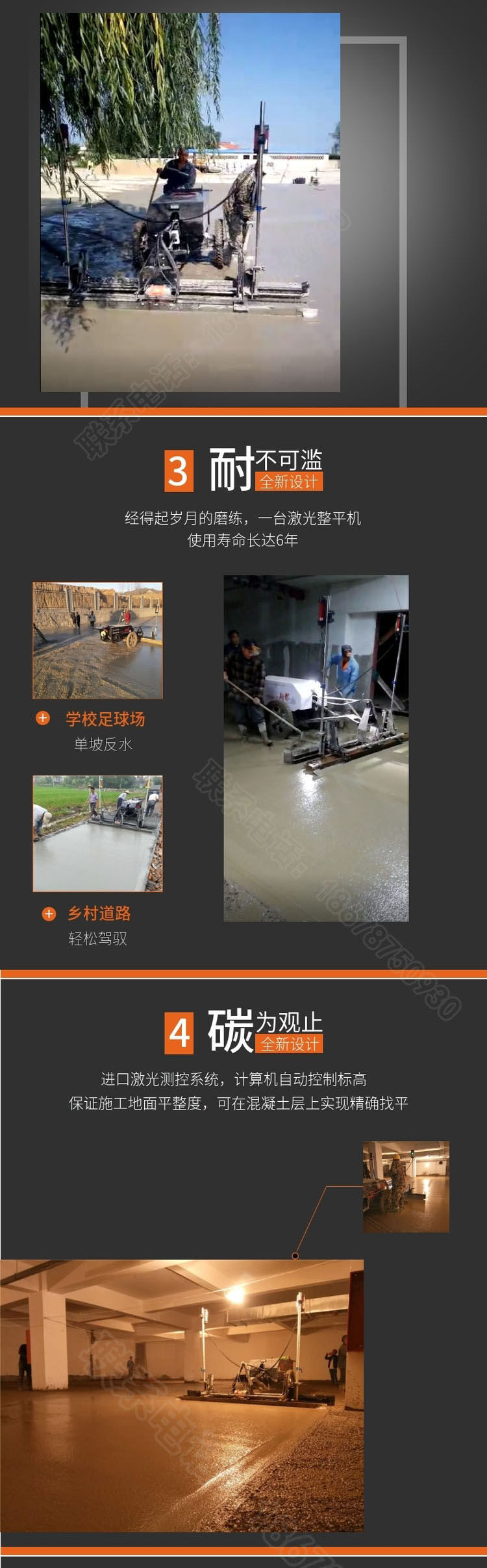 三、平整度及整体性更好:传统工艺施工,一天支模,一天浇灌,只能一块一块跳开施工,局限性大,不能连续作业,且整体性不好,容易引起施工缝的累积误差。激光整平机对于大面积的地坪一次整体铺筑,效率及整体度更高,整个地坪完工使地面整体性更好,这是传统施工完全做不到的。