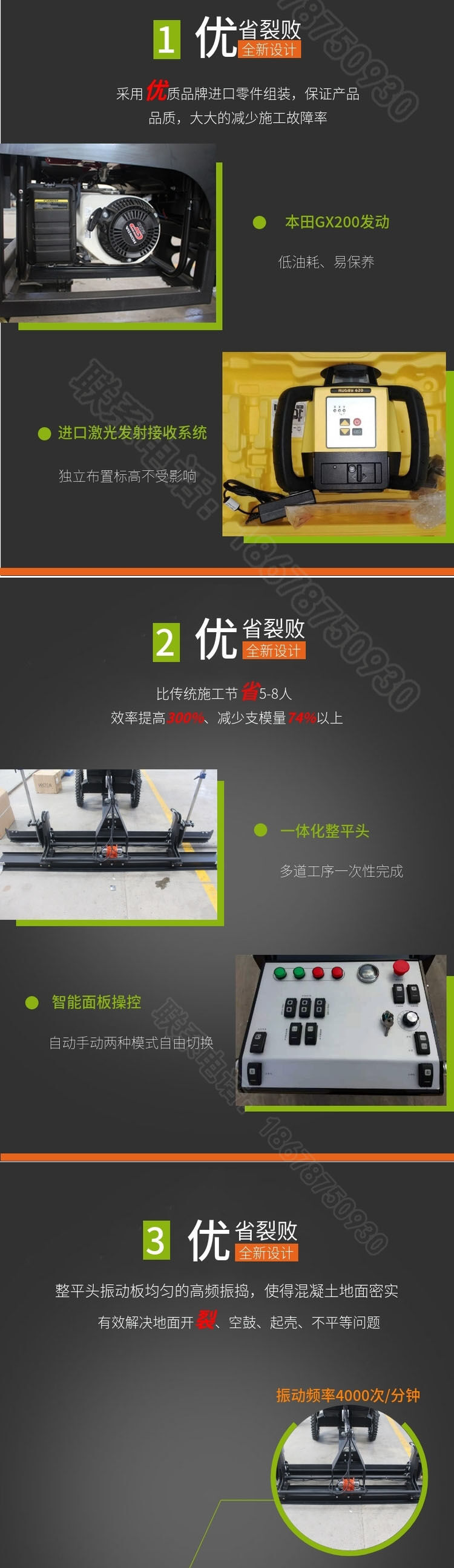 一、减少人力成本,翻倍提高效率:传统工艺施工人数较多,需要支模板(槽钢)、打点、摊铺。需要人力20人左右。每天施工面积在700平方。采用ued网站激光整平机总人数比传统工艺减少一多半。可单人操作。每天施工面积在2500平---3500平,大大降低了人力成本。