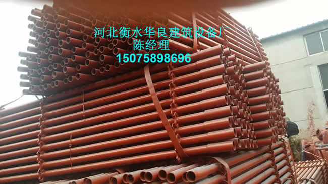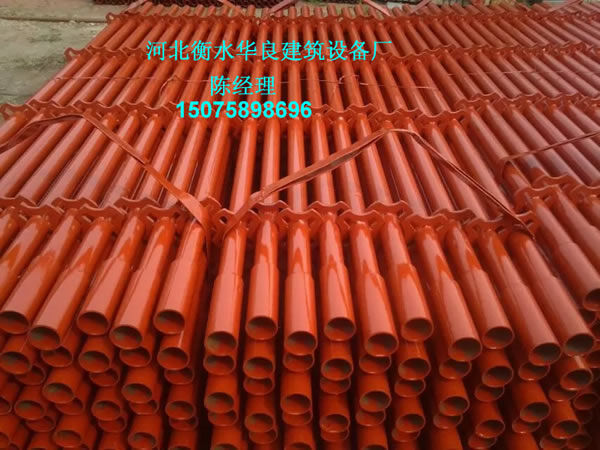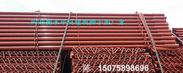 河北衡水华良建筑器材联系电话:150-7589-8696 ,轮扣脚手架、碗扣脚手架、快拆式脚手架、承插式新型脚手架、直插式脚手架、钢管脚手架、建筑脚手架,新型建筑支撑,脚手架,模板支撑,新型模板支撑, 新型建筑支撑。这种新型材料的特点是:耐腐蚀,弹性大,坚固不变形。易搭拆脚手架,施工速度快的脚手架。 每根支撑杆可以支撑3-4吨左右,两根主龙脊之间可以承重2-2.5吨的重量,每根副龙脊可以承重1吨。现在工地现浇水泥一般厚度也就是10-15厘米,同等面积重量最多100-150公斤,所以这个支撑力度一般高层建筑完全够用。