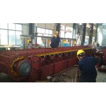 槽板为圆弧搭接式(OK板),采用低合金钢板组焊而成,强度高、耐磨损、不漏料,输送槽底板厚度≥16-25mm、此板冲压成型,在槽板上下增加了80-120mm加强筋,提高了整体的刚度、强度及耐磨性,延长使用寿命。槽板互相搭接,工作时不漏料,槽板上下加强,具有更大的承载能力;