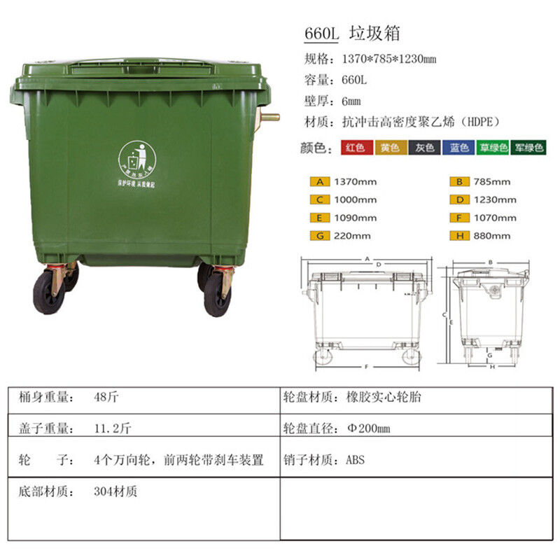 660升环卫垃圾桶厂家,加厚新料户外垃圾车价格,660升户外垃圾桶批发,赛普塑业生产的医疗垃圾桶采用高密度聚乙烯(HDPE)一次注模而成,绝无焊缝;塑料垃圾桶容易清洗,擦洗后仍光洁如新,目前在建设绿色重庆,健康重庆,宜居重庆等,而城市的形象都关系到垃圾桶,垃圾桶是城市中不可或缺的环保设施,如小区垃圾桶,街道垃圾桶,660升加厚垃圾桶厂家,加厚新料户外垃圾桶价格,660升户外垃圾桶批发马路垃圾桶,物业垃圾桶等等。除了考虑垃圾桶的外形,重要的一点还是垃圾桶的质量和容量。我们生产的垃圾桶小到40升,大到上千升。大小容量均有,是物业及环保业的。供应重庆各区各县各企业塑料垃圾桶,所有材质为PE新料制品。660升加厚垃圾桶厂家,加厚新料户外垃圾桶价格,660升户外垃圾桶批发