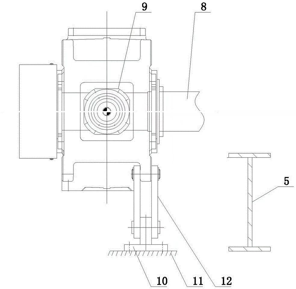 现有的重型板式给料机驱动机构结构如图2所示,包括驱动机构9,驱动机构9下端设置扭力臂12,扭力臂12下端设置有连接座10,连接座10与地基11相连;其驱动机构9与重板主体5之间不相连。由于重型板式给料机工况恶劣、振动较大,驱动机构9单独与地基11相连,造成驱动机构9的震动与主机的震动不同步,因此,这种不同步的震动对链轮轴8伤害较大,严重时可导致链轮轴8断裂。