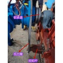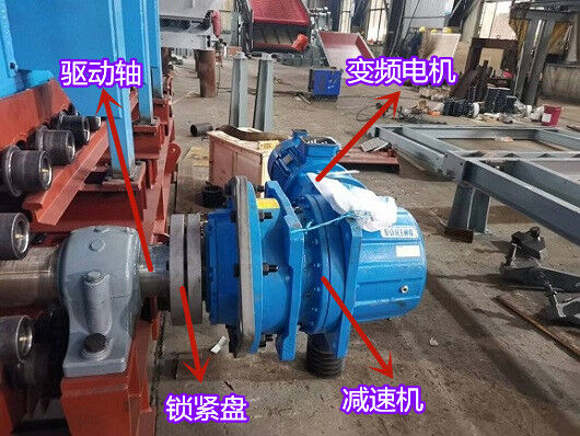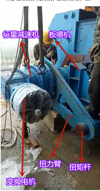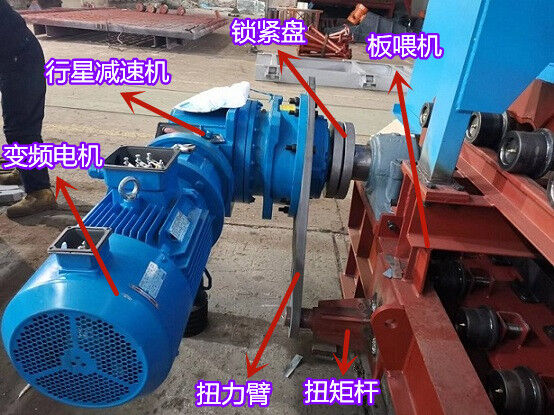驱动机构由电机、减速机、锁紧盘和扭力装置组成,驱动机构通过锁紧盘带动链轮轴旋转,从而对物料进行输送。为了抵抗驱动机构随链轮轴旋转的力,扭力装置需要固定在地基上或者机架上。