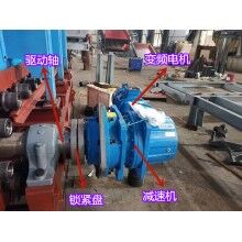 2)该装置为直交轴支点浮动式,主轴套装在行星直交减速器的空心输出轴内,通过锁紧盘将两者联结起来,其特点是悬挂式,重量轻,速比大,拆装及维修方便。