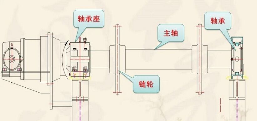 该装置主要由轴、链轮、支承辊等件组成。两端支撑为滚动轴承,主轴与减速器、空心轴套装在一起,通过锁紧盘将其二者连接到一起,达到传递扭矩的要求,结构紧凑。