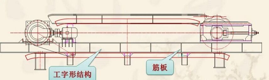 是由钢板焊接而成的工字形结构,在上下翼缘板之间焊有若干筋板,两个工字形主梁由若干槽钢、工字钢组焊为一整体,其结构坚固、稳定。