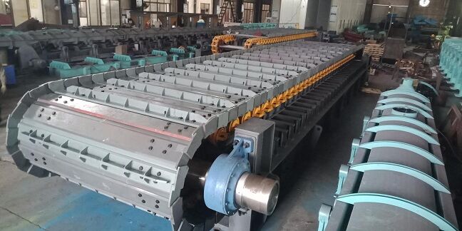 (3)辊体通过卡键定位在通轴上,并锁紧,辊体长度与负荷槽板上固定运转链条的加厚槽板等长并对应,支承回程槽板负荷。
