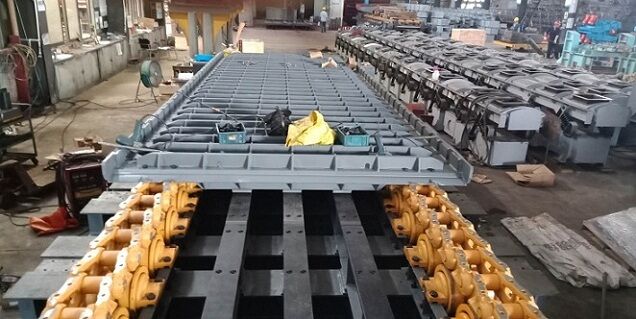板式给料机安装顺序为:底座---机架---传动装置---及驱动轮---张紧轮---上下托辊---链带---槽板---受料槽和卸料槽---栏板。