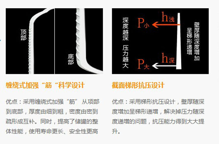 1)产品采用韩国进口高质量LLDPE作为产品生产原材料,生产出来的pe储罐具有无毒、无味、耐酸、耐碱、耐冲击、耐高温、耐寒、不易老化等优点。