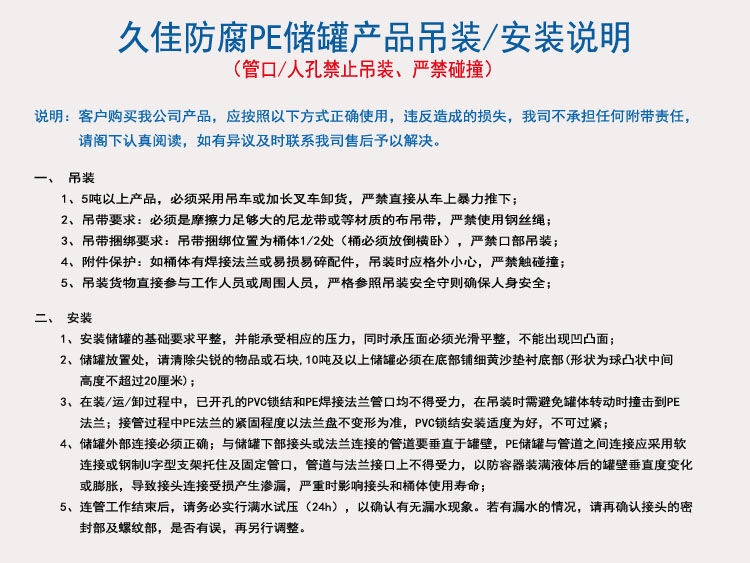 2)公司多年研发,结合国内外先进的滚塑产品生产配方,研发出专属久佳防腐环保型pe储罐生产配方,能够大大提升产品的质量与性能,所用辅料也是绿色卫生安全无污染的辅料,质量有保障;