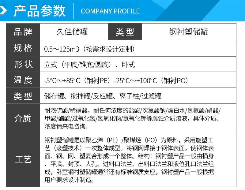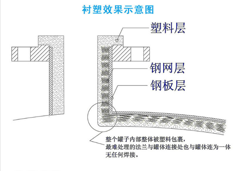 钢衬塑产品一般由桶身、平底、封顶、人孔、进料口法兰、出料口法兰和液位孔口法兰组成,卧室钢衬塑储罐通常还有标准钢质支座,钢衬塑产品一般根据用户要求设计制造。