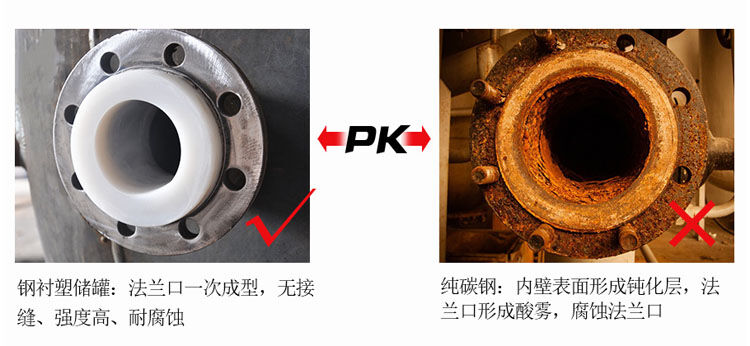 产品具有无焊接缝、不渗漏、无毒性、抗老化、抗冲击、耐腐蚀、寿命长、符合卫生标准等优点。它弥补了全塑滚塑储罐刚性强度差,不耐压,耐温差的缺点。产品内衬面平整、光滑、坚固,与传统的钢衬塑料板储槽、钢衬橡胶储罐、钢衬玻璃钢贮槽相比,具有更良好的耐腐蚀、不渗漏、不剥离、耐磨损、可耐一定压力、可耐较高温度、寿命更长等优点,是储存腐蚀液体的理想容器,也是一种极为优异的耐腐蚀储罐。
