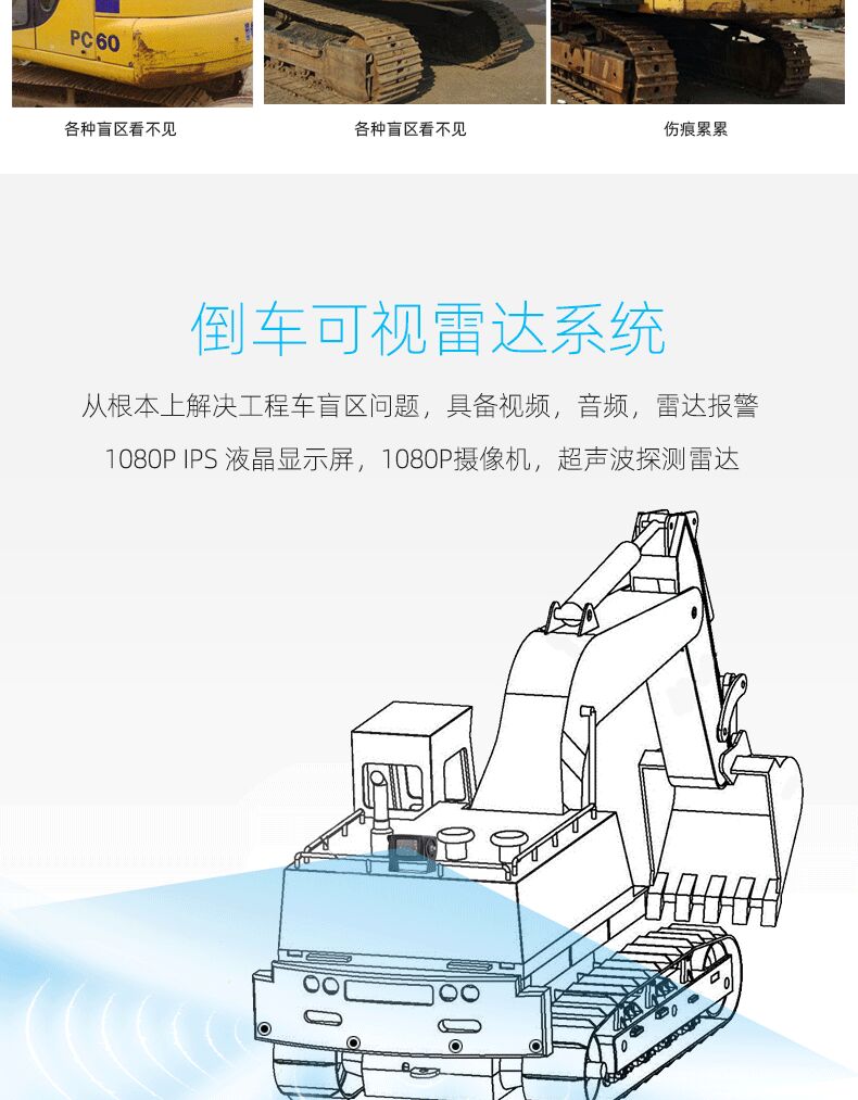 本产品是针对大型机械和卡车货车倒车视野不好的环境设计和制作的倒车雷达。通过摄像头将车后环境通过视屏直接显示到显示屏上,让驾驶员直观了解车后环境;另外,超声波探头精确探测车后障碍物距离,并且在显示屏显示障碍物距离并发出其它警示信号。从而使驾驶者在探测范围内能方便地判断车后障碍物的距离、方位和所在区域,得到及时警示,达到安全倒车的目的。此款产品具有防水、防震、防干扰,探测距离远等优点。