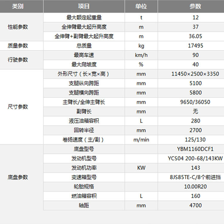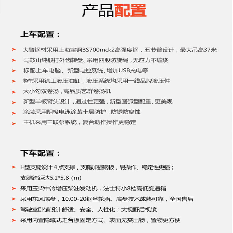 1.大臂钢材采用上海宝钢BS700mck2高强度钢,五节臂设计,最大吊高37米
